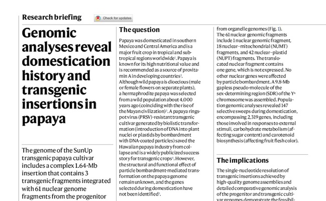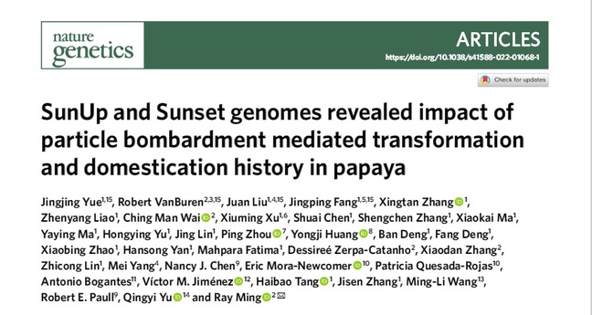 2022年5月12日,海峡联合研究院基因组与生物技术研究中心研究团队在国际权威学术期刊《自然遗传学》(Nature Genetics)在线发表了题为“ SunUp and Sunsetgenomes revealed impact of particle bombardment mediated transformation and domestication history in papaya” 的研究成果。此外,Nature Portfolio 同步在线发表题为“Genomic analysis reveal domestication history and transgenic insertions in papaya”的研究简报。该研究破译了番木瓜转基因品种SunUp与非转基因品种Sunset高质量的基因组图谱,首次揭示了植物基因枪介导的转基因过程对基因组结构和功能的影响,以及番木瓜地理起源和驯化历史。该成果是在植物转基因过程解析方面取得的原创性突破,对深入解密植物转基因过程具有重要参考价值,对推动果树作物的基础研究以及品种改良等具有里程碑式的意义。