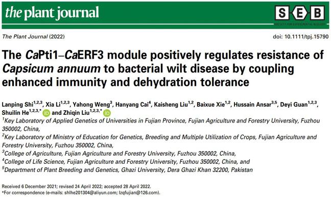 近日,The Plant Journal(TOP期刊)在线发表了开云网页版应用遗传学高校重点实验室何水林/刘志钦老师团队题为CaPti1/CaERF3 module positively regulates resistance of Capsicum annuum to bacterial wilt disease by coupling enhanced immunity and dehydration tolerance(CaPti1/CaERF3模块通过同时激活植物免疫与脱水耐性提高辣椒抗青枯病水平)的研究论文。