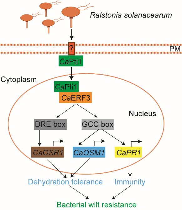 该研究综合利用反应遗传学、生化以及分子生物学等方法,发现CaPti1和CaERF3均在青枯菌侵染下上调表达,且在辣椒抗青枯病中和耐旱中均起正调节作用。通过染色质免疫共沉淀(ChIP)和凝胶阻滞实验(EMSA)分析,发现CaERF3在青枯菌侵染的辣椒植株中可与免疫反应相关基因CaPR1和耐脱水相关基因CaOSM1和CaOSR1的启动子相结合,且发现CaPti1和CaERF3可在细胞核内互作,该互作促进了CaERF3与这些靶基因启动子的结合并提高了它们的转录表达水平,与之相伴随的是叶片气孔以依赖于ABA信号通路的方式关闭和蒸腾作用的降低,最终使辣椒耐脱水能力提高。