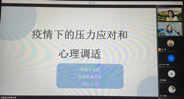 讲座中,段鑫星教授运用“三位一体脑理论”“战斗或逃跑反应理论”、“替代性同理心”等心理学专业知识,结合鲜明的案例分析了当前疫情下人们常见的情绪问题、身体问题、行为问题、精神问题,并与师生们分享了压力应对和心理调适的十大策略:一是自我察觉,及时发现自身情绪;二是运动,以健康的身体应对挑战;三是阅读,学会让时间慢下来;四是联结,与身边和远方的朋友沟通交流;五是接纳,接收并正视自身存在的不完美;六是适应,通过自我调节适应不断变化的外部环境;七是改变,以实际行动代替完美的想法;八是信念,坚定自我、保持初心;九是积极,以乐观向上的心态迎接生活中的不如意;十是韧性,顽强的意志是抵抗艰难险阻的坚石。