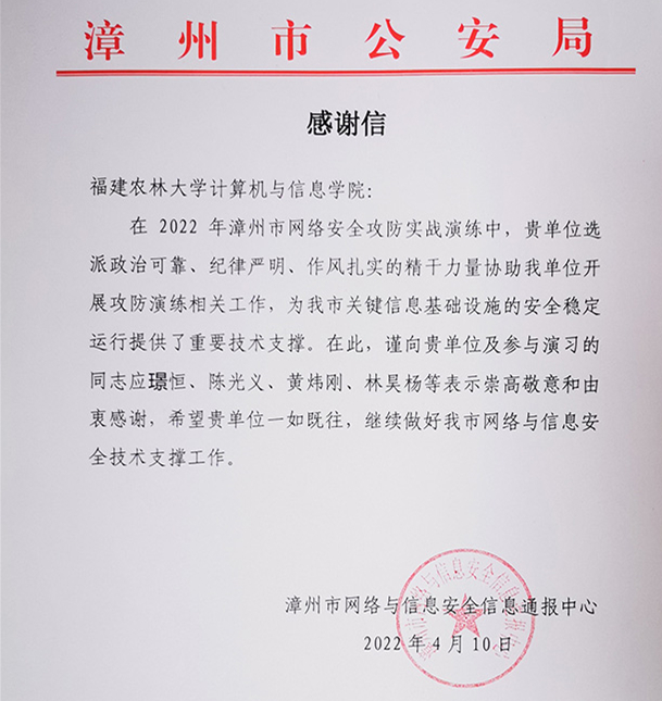 5月20日至24日,2022年漳州市第二轮网络安全攻防演练行动举行,我校一支队伍应邀参赛获佳绩并得到了漳州市公安局的表彰。参赛队伍由我校海洋学院2019级水产养殖专业应璟恒同学担任队长,计算机与信息学院2019级电子信息工程专业陈光义、2020级网络空间安全专业黄炜刚、2021级网络空间安全专业林昊杨同学为队员,指导老师为网络空间安全系主任纪祥敏副教授。在本次漳州市第二轮网络安全攻防演练行动期间,我校参赛队伍以总分10200的成绩排名第一,并收到了漳州市公安局发来的感谢信。