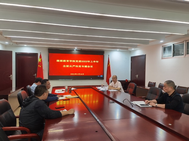 5月26日下午,继续教育学院党委在512会议室召开2022年上半年全面从严治党工作会议。会议认真学习习近平总书记关于全面从严治党系列重要论述和加强高校党的建设重要讲话精神,深入贯彻2022年学校全面从严治党工作会议精神,总结2021年学院全面从严治党工作,提出2022年重点任务。院党委书记范焕谦主持会议。