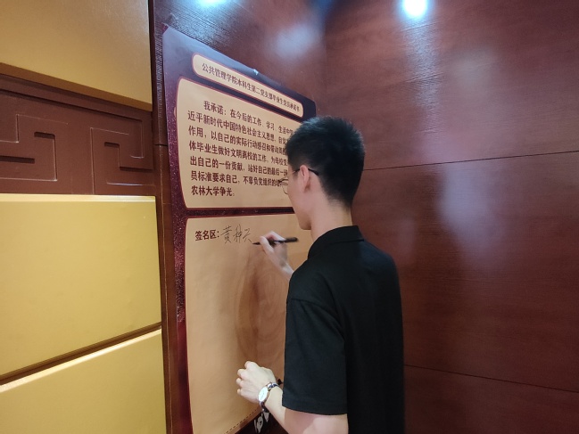 会议最后,全体党员同志签署了文明离校承诺书,并面向党旗庄严重温入党誓词。党员们集体回忆了入党宣誓时的庄严承诺,坚定了毕业生党员永远跟党走的决心和信念。