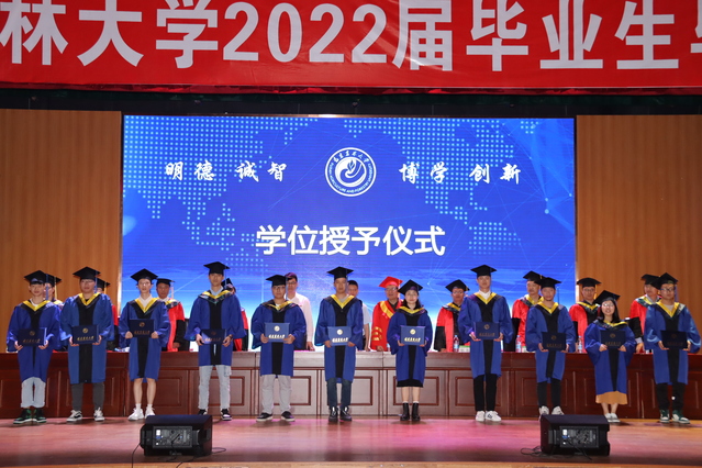 学位授予仪式上,主席台就坐的领导、老师为全体毕业生拨穗正冠并颁发毕业证书和学位证书。典礼在激扬的校歌声中落下帷幕。
