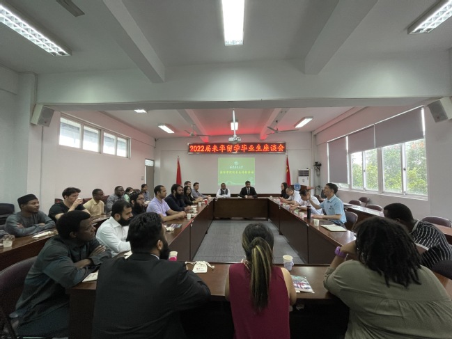 6月16日下午,国际学院在明北附303召开2022届来华留学毕业生座谈会,座谈会由院党委副书记刘敏主持,国际学院党委书记林平、院长吴锦程、教师代表、辅导员、留学生管理办公室工作人员、2022届全体来华留学毕业生等参加会议。