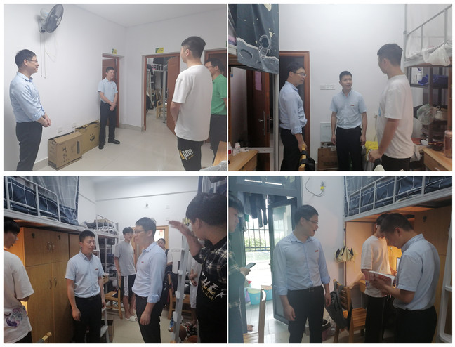 为防范和杜绝安全事故的发生,营造和谐文明的宿舍环境, 6月16日下午,机电工程学院党委副书记(主持工作)修新田,副书记曹滨斌带领全体政工干部对学生宿舍进行安全检查。
