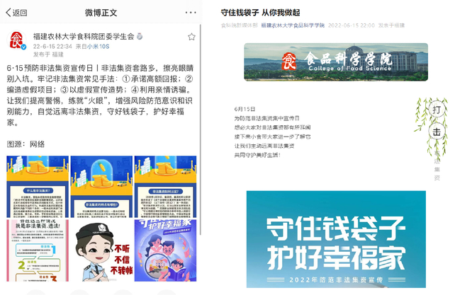 6月9日-6月17日,食品科学学院以线上与线下相结合的方式开展“2022年防范非法集资宣传月”系列活动。 本次宣传月活动以“守住钱袋子,护好幸福家”为主题,旨在宣传防范非法集资的相关知识,引导师生自觉远离非法集资风险,共同守护幸福生活。