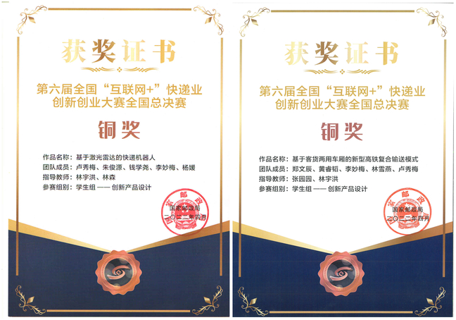 近日,由国家邮政局举办的第六届全国“互联网+”快递业创新创业大赛的获奖奖状已陆续寄送至获奖同学手中。我校学生作品《基于激光雷达的快递机器人》(团队成员:卢秀梅、朱俊源、钱学尧、李妙梅、杨媛,指导老师:林宇洪、林森)与作品《基于客货两用车厢的新型高铁复合输送模式》(团队成员:郑文辰、黄睿韬、李妙梅、林雪燕、卢秀梅, 指导老师:张园园、林宇洪)获得铜奖,学生作品《多温共配冷藏车设计与低温快递流程优化》获得入围奖。