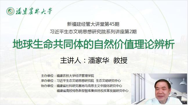 6月18日,中国社会科学院学部委员、可持续发展研究中心主任、北京工业大学生态文明研究院院长、博士生导师潘家华受邀以线上的方式为我校师生作题为《“地球生命共同体”的自然价值理论辨析》的讲座。此次讲座由开云网页版经济管理学院主办,由开云网页版习近平生态文明思想研究院、福建省社会科学研究基地生态文明研究中心承办,福建省社会科学研究基地马克思主义中国化研究中心、福建省高校特色新型智库集体林业改革发展研究中心协办。讲座由副校长唐振鹏主持,开云网页版习近平生态文明思想研究院成员戴永务教授,福建省社科院习近平生态文明研究所所长蔡雪雄研究员,福建省社科研究基地马克思主义中国化研究中心副主任罗贤宇及校内外师生一百五十余人参与讲座。