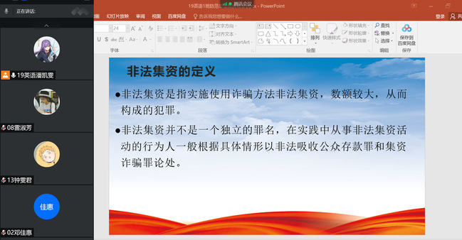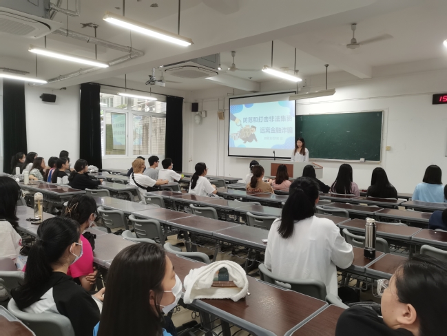 在各班级的主题班会现场,班委们围绕投资理财、民间借贷、虚拟货币、私募基金等的常见案例,通过视频展播,PPT讲解等形式向同学们普及了非法集资的概念、主要表现形式和六大障眼法等知识,强调了非法集资的危害性,引导同学们理性消费,自觉抵制高利诱惑,防范非法集资。2021级英语专业陈佩婷表示,此次班会让我认识到非法集资会严重干扰正常的经济、金融秩序,极易引发社会风险,而这种风险离我们并不遥远。作为在校大学生,我们要做到“不参与、能识别、会举报”,与同学、家人共同守护好手中的“钱袋子”。