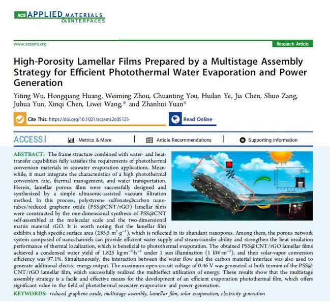 近期,我校材料工程学院袁占辉教授团队在材料科学领域国际TOP期刊ACS Applied Materials & Interfaces在线发表了题为High porosity lamellar films prepared by multistage assembly strategy for efficient photothermal water evaporation and power generation(多级组装策略制备的高孔隙密度层状膜用于高效光热蒸汽产生和发电)的研究论文(图1)。