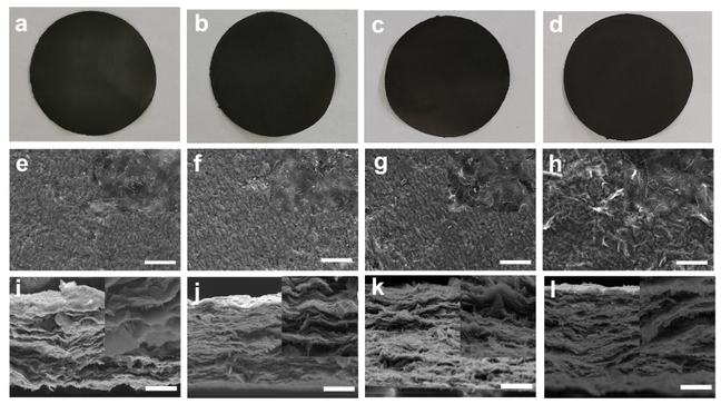 (a-d)实体照片;(e-h)表面SEM图像;(i-l) SEM图像的侧面,刻度条为10 μm和1 μm。(a, e, i)为1-PSS@CNT/rGO;(b, f, j) 为2-PSS@CNT/rGO;(c, g, k)为3-PSS@CNT/rGO;(d, h, l)为4-PSS@CNT/rGO。