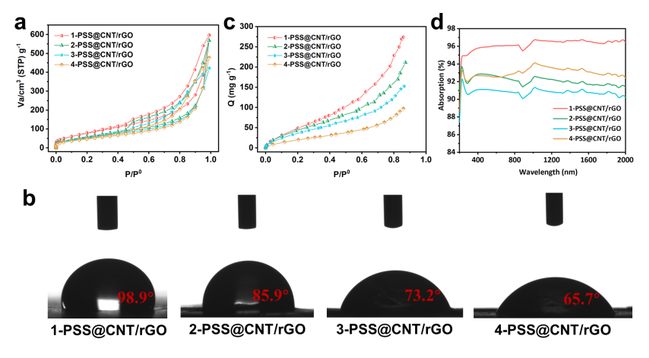 孔径分布可以看出(图3a),n-PSS@CNT/rGO层状膜的孔径分布集中分布在5-20 nm。接触角显示(图3b)亲水性聚合物PSS的包裹,改善了CNT原有的疏水特性,形成了一维亲水性材料。和SEM测试中观察到表面PSS@CNT明显增加现象相呼应。容易理解亲水材料的增加会导致材料表面亲水性增加。水蒸气吸附表征分析(图3c)孔道内部对水蒸气的吸附并非由亲水成分(PSS@CNT)单独决定。结合表面接触角分析,发现尽管1-PSS@CNT/rGO层状膜的表面亲水性最弱,但是其内部纳米孔道结构传输水的性能却是最佳。此外湿润状态下,n-PSS@CNT/rGO层状膜的光吸收在90%以上(图3d)。