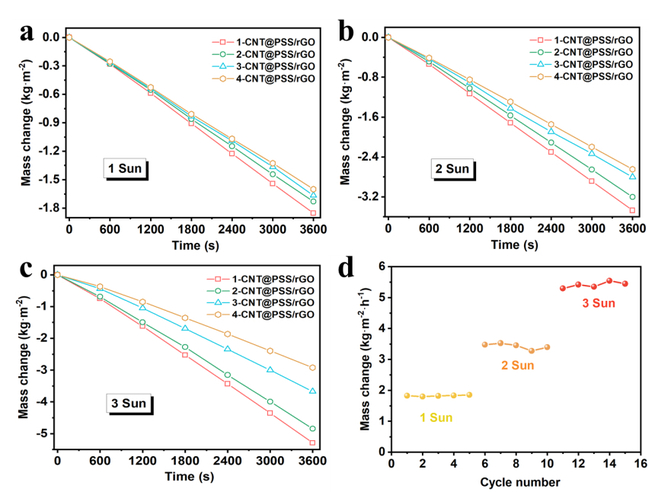 n-PSS@CNT/rGO膜的水质量变化:(a) 1倍太阳光、(b) 2倍太阳光、(c) 3倍太阳光和(d) 1-PSS@CNT/rGO膜在不同太阳照度下循环性能的比较。