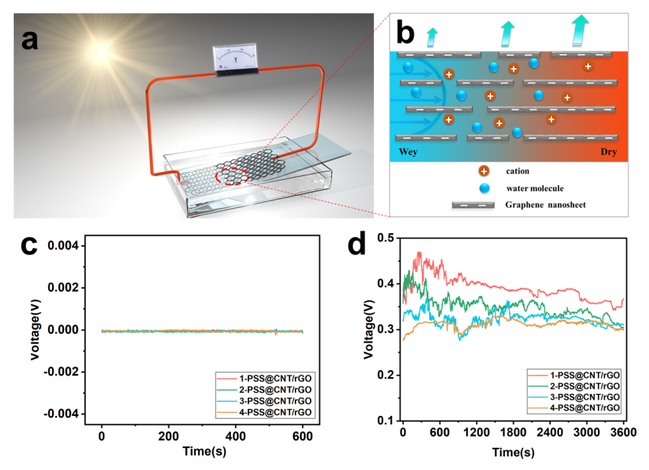 (a)层状膜蒸发驱动发电示意图;(b)薄膜微通道内水流诱导流动电势产生的示意图;(c)干燥条件下n-PSS@CNT/rGO薄膜充分暴露于1太阳下的开路电压;(d)由n-PSS@CNT/rGO薄膜组成的器件在0.6 M氯化钠溶液和1太阳下产生开路电压。