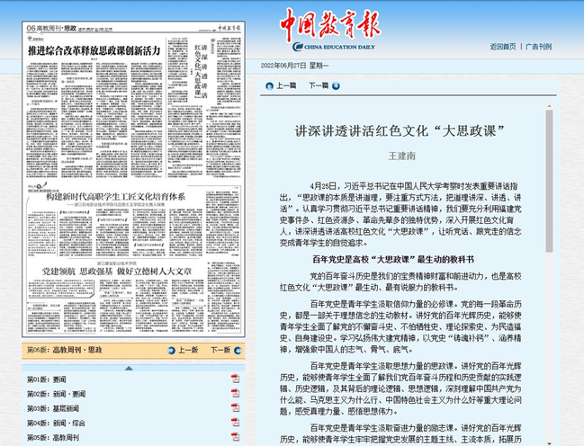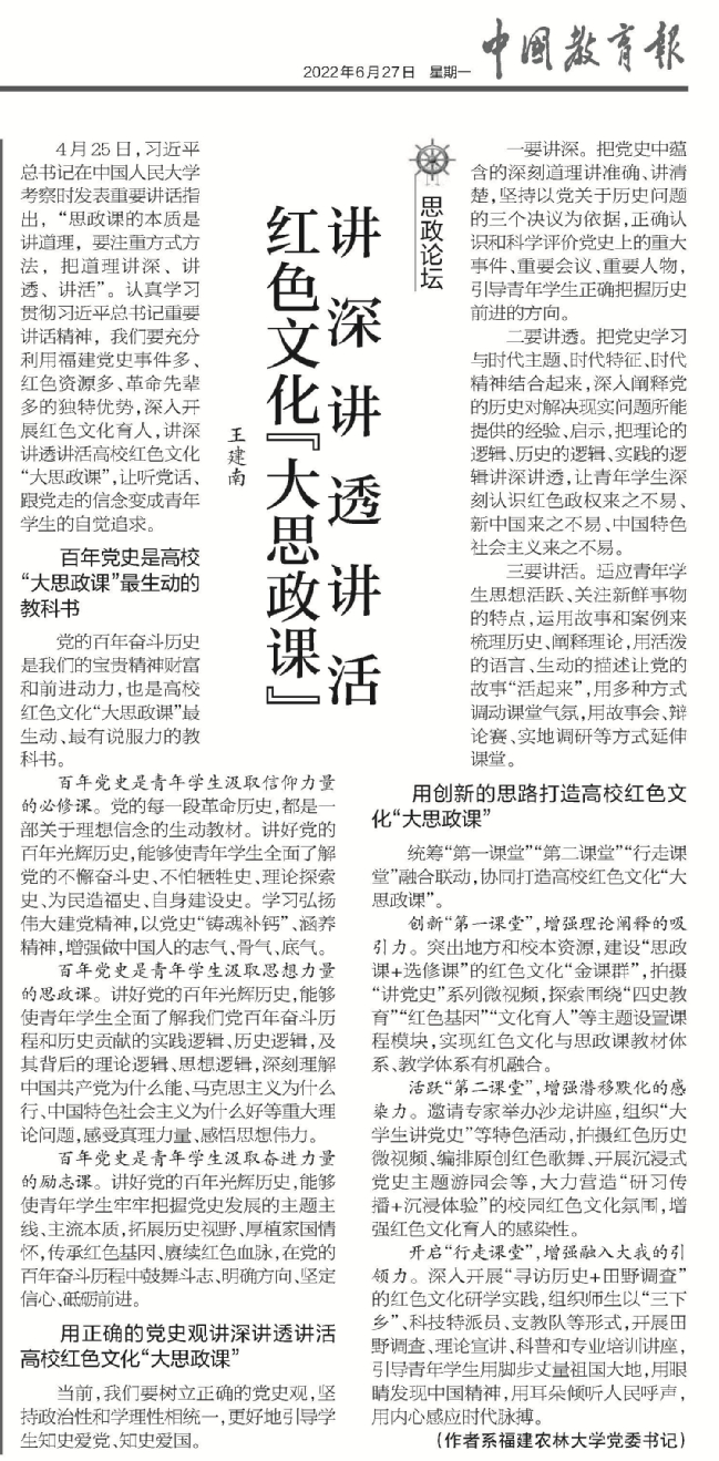 编者按:6月27日,《中国教育报》刊登我校党委书记王建南的署名文章《讲深讲透讲活红色文化“大思政课”》,现全文转载如下。