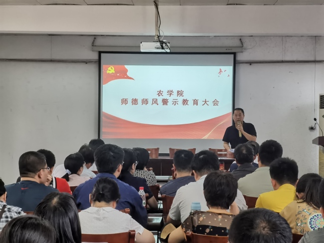 6月30日下午,农学院在学院302多媒体教室召开全院教职工大会暨师德师风警示教育和保密工作教育大会。学院党委书记洪诚、院长曾任森、党委副书记吴荣辉、副院长兰涛、吴仁烨和学院全体教职工参加了会议。