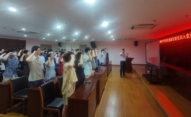 仪式在庄严的《国际歌》中开始,学院党委书记陈为德领誓,新老党员举起右手,握拳过肩,面向鲜红的党旗,通过铮铮誓词庄严表达自己坚定不移、终生不渝的信仰和决心。在庆祝中国共产党101岁生日之际,涵养了师生党员忠于党、忠于祖国、忠于人民的政治品格和爱国情怀。