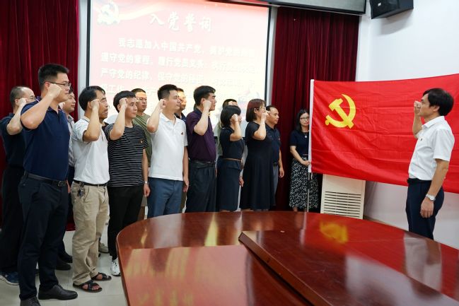 面对鲜红的党旗,全体党员干部重温了入党誓词。铿锵誓言在会场久久回荡,一字一句,神圣而豪迈,让每位党员更加坚定了自己的庄严承诺和入党誓言,深切表达对党忠诚、坚定信念,在后勤保障工作中不忘师生为本的初心,牢记服务师生的使命,时刻以党员的标准严格要求自己,以实际行动展现共产党人的政治本色。