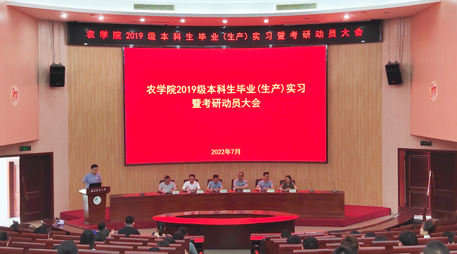 7月1日,农学院在博学报告厅召开2019级本科生毕业(生产)实习暨考研动员大会。院长曾任森、院党委副书记吴荣辉、副院长吴仁烨、农学系主任古力、种子系主任季彪俊、植科系主任贾琪及各系专任教师、2019级全体本科生参加了会议。会议由辅导员陈键主持。