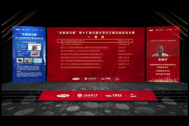 “华展物流杯”第十七届全国大学生交通运输科技大赛是由教育部高等学校交通运输类专业教学指导委员会主办,上海海事大学承办,深圳市华展国际物流有限公司协办的全国性大学生科技竞赛,是我国交通运输领域参赛高校最多、参与学生最多、社会影响力最大的全国性顶级赛事。此次全国共有185所高校报名参赛,提交了1473项参赛作品,经初赛评审,来自中南大学、上海交通大学、北京航空航天大学、大连海事大学、武汉理工大学等94所高校的213项作品脱颖而出,进入本次大赛总决赛,大赛共产生一等奖作品 37 项、二等奖作品 74 项、三等奖作品 101 项以及优胜奖作品 46 项。颁奖典礼于7月10日上午隆重举行。