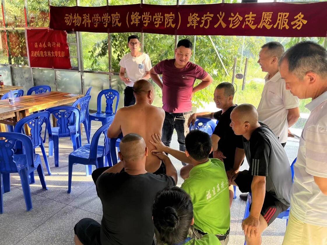 为加深蜂农对蜂产品养生保健功能的认识,实践队员还向蜂农发放自制的《蜂产品养生保健实用手册》60余本。随后,实践队员为前来参加培训的会员进行蜂疗技术指导,并留下药品以供后期所需,使掌握蜂疗技术的蜂农能继续为当地村民解决病痛,既授人以“鱼”,也授人以“渔”。实践队员还深入蜂场为蜂农进行技术指导,帮助蜂农解决养蜂过程中的难题。