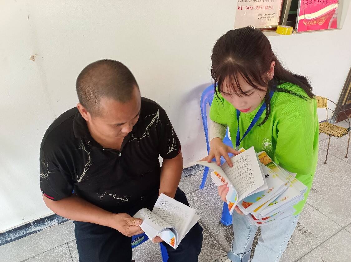 实践队员给蜂农分发自制《蜂产品养生保健实用手册》 雷建朋 摄