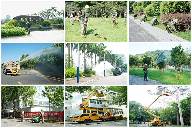 一是精心组织,积极开展绿化网格化管理。分片区专人负责绿地抗旱巡查,避免死角和盲区,对观音湖、中华园等绿地就近利用湖水灌溉,对易旱和缺少水源的区域出动洒水车浇灌,每日洒水超过40吨,多措并举确保灌溉效果。二是通力配合,努力做好“百日攻坚”基建项目树木移植工作。目前已累计移植假槟榔、三角梅、芒果等树木约103株,并安排专人浇水养护,确保树木成活率。三是科学安排,认真做好绿化安全隐患排查整治。针对金山校园内大树、老树较多,6月以来出动高空作业车10余次,累计完成570余株南洋楹、桉树、白兰等高大乔木修剪作业,消除树木遮挡路灯影响行车视线、枯枝死叉坠落等带来的安全隐患,做好台风天应对准备工作。