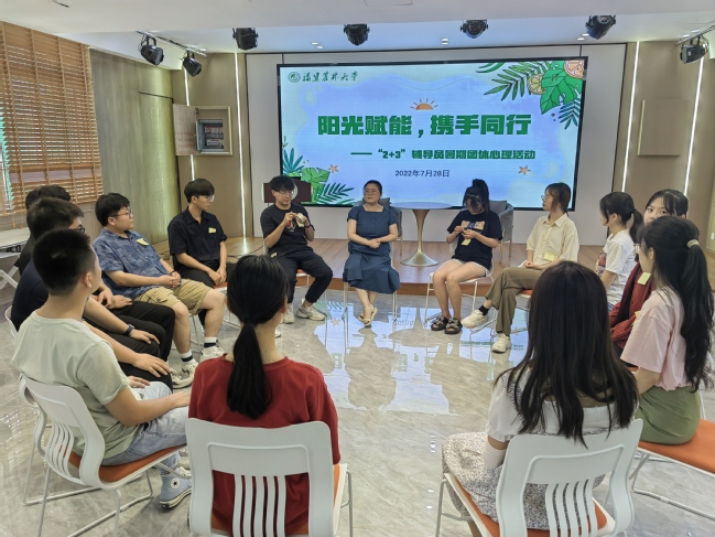 7月28日下午,学工部组织2022年新入职推免生辅导员开展“阳光赋能,携手同行”团体心理活动,本次活动作为新任推免生辅导员暑期跟岗学习培训的重要环节,旨在增强辅导员队伍的凝聚力和向心力,同时学习心理健康知识和工作技巧,为今后高效开展学生工作提供具体的方法指导。