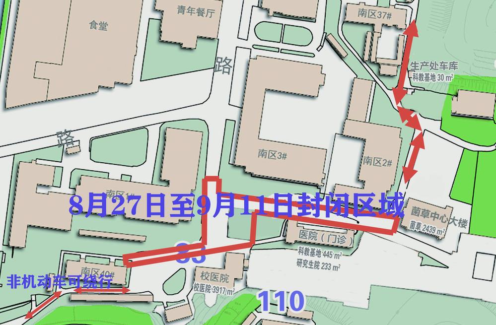 目前,金山校区雨污水管网改造提升工程(中区和南区)项目主要路段已经完成,为提升进度尽快实现南区“架空线”全面下地,拟于2022年8月27日至9月10日对校医院、南区40#楼、菌草中心区域进行封闭施工,现将有关注意事项通告如下: