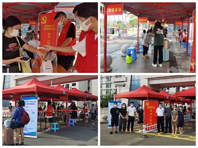 报到当日,在校区南北门入校审核通道校园办、四个学院及物业、保安组建了返校志愿服务队,并设立党员示范岗,“一站式”开展行李消毒、测量体温、身份核验等返校工作。此外,校园办还提供了免费接驳车、解暑茶、备用雨衣等暖心服务,为学生安全有序返校保驾护航。