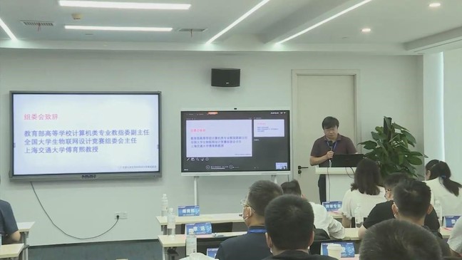 教育部计算机教指委副主任傅育熙教授致辞介绍了竞赛创建历程,计算机教指委对物联网工程专业建设的重视程度,最后向全国参赛学子提出殷切希望:“一边学习,一边了解世界!”。