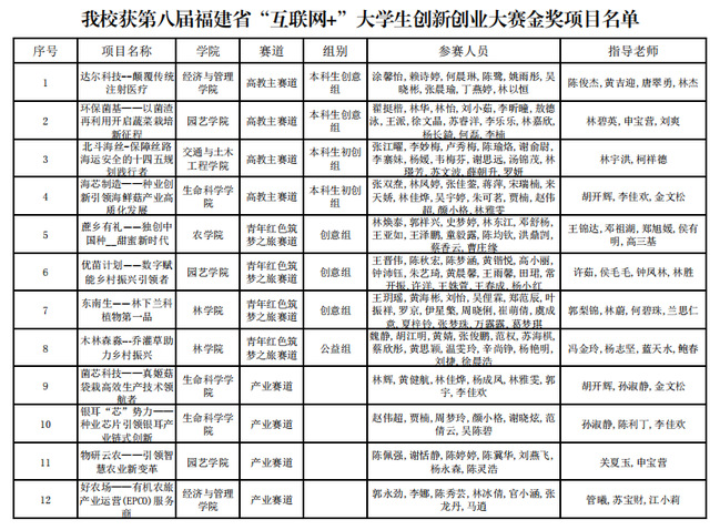 近日,省教育厅公布了第八届福建省“互联网+”大学生创新创业大赛获奖名单。我校获金奖12项、银奖19项、铜奖16项,获奖总数居全省高校第二。1个项目获“高教主赛道最佳带动就业奖”、1个项目获“高教主赛道最具商业价值奖”、3个项目获高教主赛道“十佳人气奖”、5个项目获青年红色筑梦之旅赛道“十佳人气奖”、3个项目获产业赛道“十佳人气奖”,王锦达、冯金玲、关夏玉、许茹、孙淑静、陈俊杰、林碧英、林宇洪、胡开辉、郭梨锦、管曦等11位老师获“优秀创新创业导师”称号。学校获“高教主赛道高校集体奖”,连续8届获大赛“高教主赛道优秀组织奖”,产业赛道“优秀组织奖”。