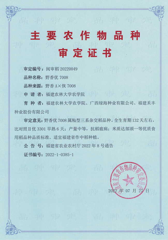 在日前召开的福建省主要农作物品种审定委员会九届一次主任委员会会议上,我校农学院张书标团队选育的优质抗病水稻新品种野香优7008(闽审稻20220049)通过审定。野香优7008属籼型三系杂交稻品种。在福建省作中稻种植,全生育期132.1天,比对照Ⅱ优3301早熟6.3天。两年区域试验平均亩产622.5千克,比对照Ⅱ优3301增产0.4%。株高125.7厘米,穗长24.0厘米,每亩有效穗数15.7万,每穗总粒数180.8粒,结实率85.7%,千粒重25.7克。稻瘟病综合指数两年分别为2.4、2.1,穗颈瘟损失率最高级1级,抗稻瘟病。米质主要指标:糙米率81.4%,整精米率71.9%,粒长7.0毫米,长宽比3.1,垩白度0.2%,透明度1级,碱消值6.7级,胶稠度73毫米,直链淀粉含量15.9%。两年的米质指标均达部颁一等优质食用稻品种品质标准。