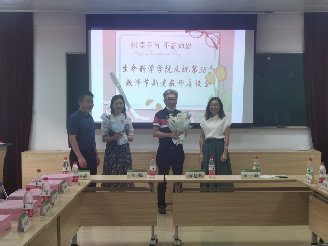 学院党委书记陈建辉、院长秦源为荣获校优秀教师的胡开辉教授、在学院行政系统长期工作即将离职的办公室工作人员郑玲老师献上鲜花;与会人员畅谈新时代生命科学高等教育内涵和教师使命,就如何进一步提升人才培养质量,加强教师队伍建设,推进学院学科高质量发展进行了深入交流和探讨。