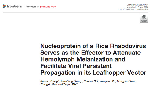 2022年5月17日在《Frontiers in Immunology》(IF= 8.786)期刊在线发表了题为“Nucleoprotein of a rice rhabdovirus serves as the effector to attenuate hemolymph melanization and facilitate viral persistent propagation in its leafhopper vector”的论文,揭示了水稻条纹花叶病毒(RSMV)在介体电光叶蝉血淋巴中逃避昆虫抗病毒黑化反应的机制,明确RSMV编码的N蛋白与黑化反应途径关键蛋白PPO的互作促进PPO的表达,并且这种相互作用可以有效地抑制PPO对活性酚氧化酶(PO)的蛋白酶解作用,从而抑制了血淋巴中对RSMV的抗病毒黑化反应。