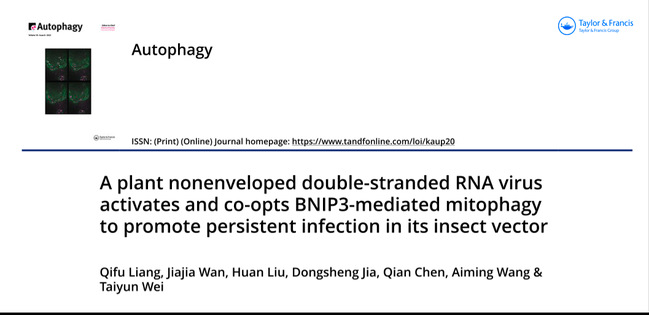 2022年7月13日在国际著名病原学领域权威期刊《Autophagy》(IF=13.391)在线发表题为“A plant nonenveloped double-stranded RNA virus activates and co-opts BNIP3-mediated mitophagy to promote persistent infection in its insect vector”的论文。报道南方水稻黑条矮缩病毒(SRBSDV)在介体白背飞虱体内触发线粒体自噬,SRBSDV编码的P7-1蛋白通过与线粒体自噬受体BNIP3的相互作用直接靶向线粒体,将线粒体隔离在自噬体内形成线粒体自噬体,以防止线粒体途径的细胞凋亡的发生,从而促进病毒在介体内的持久侵染和传播。