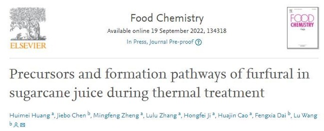 甘蔗是主要的糖料作物,其果汁富含多种氨基酸、微量元素,生物活性物质。除制糖和鲜食外,蔗汁加工已成为甘蔗产业延伸和转型的主要途径。然而,热杀菌过程中蔗汁颜色和风味的劣变问题已成为制约其发展的瓶颈。团队前期研究基础表明热处理过程中糠醛的产生与蔗汁品质劣变密切相关。糠醛具有烤杏仁香和焦甜香,带有苦味,严重影响蔗汁风味。此外,糠醛被列入世界卫生组织国际癌症研究机构公布的3类致癌物清单中,存在一定食品安全隐患,通常被作为含糖食品热加工强度的标记物。近年来,解析异味物质和非酶褐变产物的形成机理是食品加工与安全领域的研究热点,对于糠醛的分析方法、动力学模型以及影响因素的研究也越来越受到业内的关注,但相关形成机制尚未完全清晰。