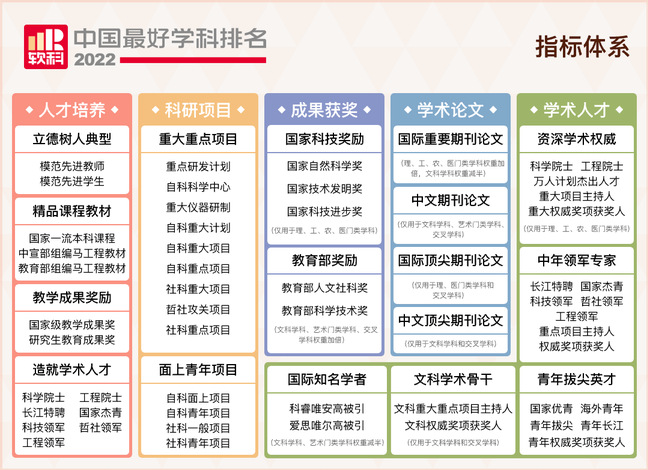 据悉,软科中国最好学科排名的指标体系包括人才培养、科研项目、成果获奖、学术论文、学术人才5个指标类别,下设17个指标,共计50余项反映学科竞争力的观测变量。本轮软科排名包括96个一级学科,各个学科排名的对象是在该一级学科设有学术型研究生学位授权点的所有高校,发布的是在该学科排名前50%的高校,共有484所高校的5035个学科点上榜。