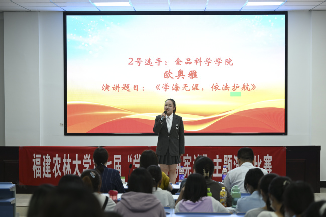 来自各学院选拔推荐的九位参赛选手,围绕“学宪法、讲宪法”主题,讲述宪法与国家、社会、个人之间的密切关系,结合时下热点话题、典型案例,传递宪法之声、弘扬宪法之情。演讲过程中,选手们饱含深情,语调铿锵,充分展现了当代大学生自信从容的青春风采。经过激烈角逐,最终来自公共管理学院法学专业的陈欣宁同学获得一等奖,并将代表学校参加福建省“学宪法,讲宪法”演讲比赛。