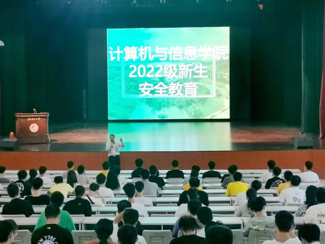 9月24日下午,计算机与信息学院在校大礼堂召开2022级新生安全教育大会。会议由校武装部(保卫处)消防科林奋老师主讲。学院党委副书记张明辉,2022级本科生辅导员穆明、黄珍华,2022级研究生辅导员陈月蓉,以及2022级全体新生参加会议。