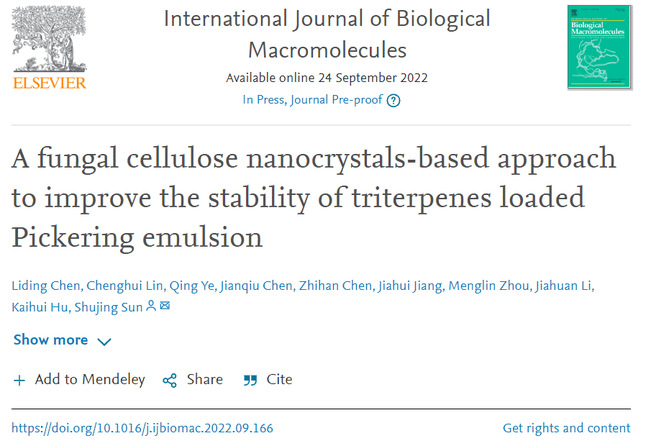 菌糠的回收再利用是困扰食用菌栽培行业的难题之一,而食用菌子实体加工残渣的回收再利用则是困扰食用菌加工行业的难题之一。团队针对该行业痛点采用杏鲍菇子实体的加工残渣进行了生物资源回收和高值化利用的探索。团队通过化学方法将杏鲍菇加工残渣降解成新材料杏鲍菇纤维素纳米晶,并应用该纳米材料稳定了可运载三萜类药物的Pickering乳液。脂质氧化与体外消化研究显示,新的Pickering乳液运载体系能较好地保护三萜类药物对抗氧、酸和消化酶的破坏,在医药领域具有广阔的发展前景。该成果发表在《International Journal of Biological Macromolecules》,论文第一作者为生命科学学院讲师陈利丁,通讯作者为孙淑静教授,开云网页版为唯一通讯单位。