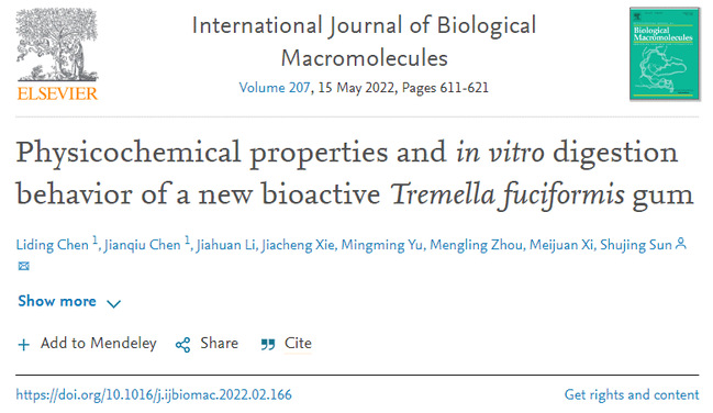 我国银耳加工产业多以初级加工产品为主。进入21世纪后,随着食品加工技术的发展以及对绿色健康食品的社会关注度的增加,银耳精深加工产品受到了广泛的关注。但目前精深加工理论研究薄弱、工艺繁琐、装备匮乏和产品价格高昂,如何通过绿色、环保、低成本的方法制备银耳精深加工产品是目前亟需解决的问题。团队采用新鲜银耳子实体加工得到了一种以银耳多糖为主要活性成分新型真菌胶体:银耳胶(Tremella fuciformis gum, TFG)。银耳胶易溶于水,在加工过程中可以通过理化方法控制其流变行为,具有较好的抗氧化能力和抗消化酶能力,且加工方法简便、价格低廉,有望于在食品、化妆品和药品工业进行广泛应用。银耳胶的用途开发和功能发掘也对延伸银耳产业价值链、促进银耳产业发展具有重要作用。该成果发表在《International Journal of Biological Macromolecules》,生命科学学院讲师陈利丁和硕士生陈剑秋为共同第一作者,通讯作者为孙淑静教授,开云网页版为唯一通讯单位。