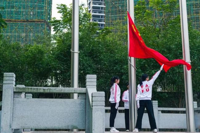 举办“爱国励志跟党走,扬帆奋进新征程”主题升国旗仪式。10月1日早上7时整,参加升国旗仪式的全体师生列队整齐,以良好的精神状态伫立在升旗台前。国旗护卫队队员踏着整齐的步伐走向升旗台,在雄壮的国歌声中,国旗伴随着清晨第一缕阳光缓缓升起,参加升国旗仪式的师生代表手握小国旗,面向国旗肃立致敬,高唱国歌,向伟大祖国致以崇高的敬意与美好的祝福。