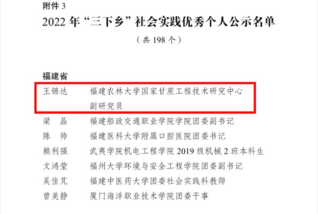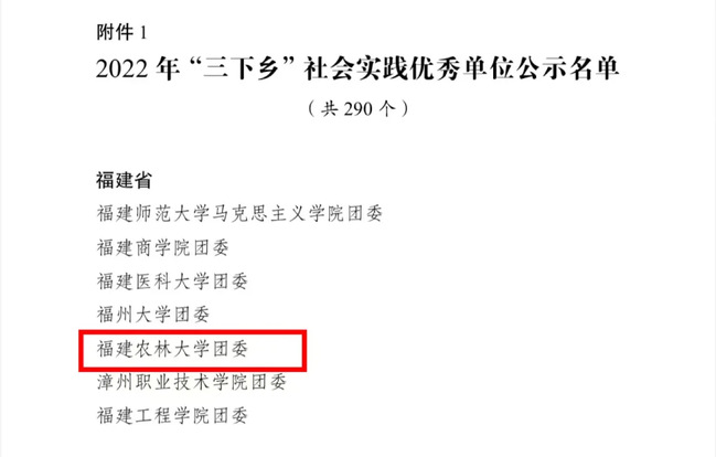 近日,团中央通报表扬在2022年全国大中专学生志愿者暑期文化科技卫生“三下乡”社会实践活动中表现突出的集体和个人,学校团委荣获“2022年‘三下乡’社会实践优秀单位”、经济与管理学院赴三明市尤溪县双碳目标下集体林业改革发展问题研究实践队荣获“2022年‘三下乡’社会实践优秀团队”、农学院王锦达副研究员荣获“2022年‘三下乡’社会实践优秀个人”。