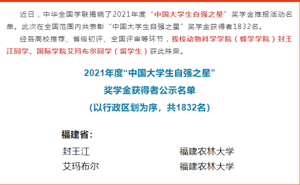 近日,由共青团中央、全国学联指导开展的2021年度“中国大学生自强之星”奖学金推报活动结果揭晓。我校动物科学学院(蜂学学院)封王江、国际学院艾玛布尔(在华留学生)2名学子荣获“中国大学生自强之星”奖学金。