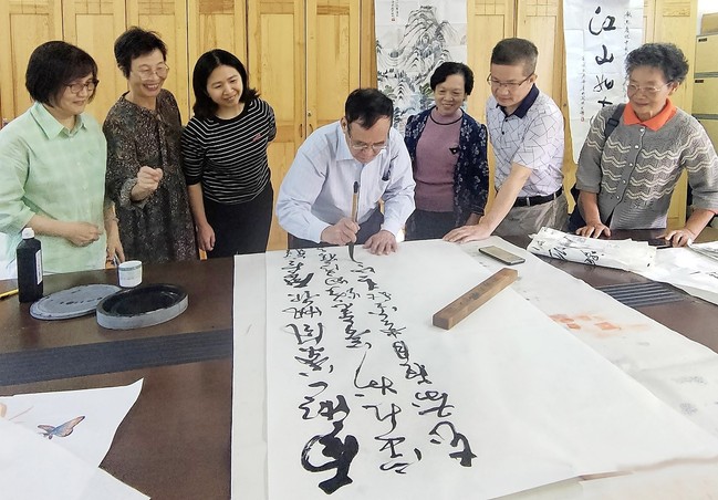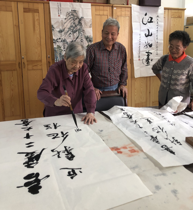 展示活动分上下半场。上半场是作品展示观摩,下半场现场挥墨交流。在整场活动中,老同志们兴致勃勃,或互相点评交流心得;或挥毫泼墨切磋技艺,校书画协会主席、校老体协书画摄影协会会长王瑞玲、校摄影协会会长叶国水做现场指导和点评,整个活动室里弥漫着浓浓的艺术氛围。邓明秀老师已95岁高龄,现场还凝神挥毫,实属难能可贵。