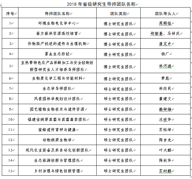 近日,省教育厅公布了2018年省级研究生导师团队验收结果,我校15个导师团队顺利通过验收,其中,环境生态电化学中心、南方森林资源高效培育博士生导师团队和生态学硕士生导师团队验收结果为优秀。