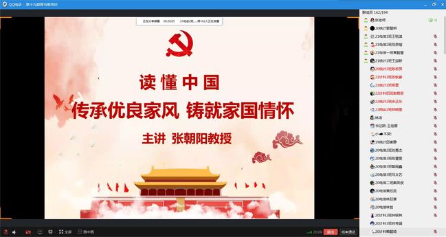为全面贯彻党的二十大精神,学习领悟习近平总书记关于青年工作的重要思想,培养造就一批政治觉悟强、综合素质高的青年马克思主义者。近日,计算机与信息学院关工委为第十九期青马班学员开设了《传承优良家风,铸就家国情怀》专题讲座,学院关工委副主任张朝阳老师给青马班学员进行了线上授课。