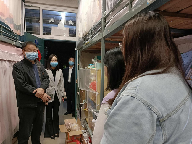 在南区学生宿舍,学院领导关切询问学生线上上课的质量与效果,关心学生是否遇到学习和生活困难。学院领导勉励同学们,在特殊时刻,要坚定不移听党话、跟党走,自觉遵守学校疫情防控的规章制度,加强防护措施,佩带口罩,不聚集,按时参加核酸检测,积极参加志愿服务,为早日战胜疫情做贡献。当前受疫情影响下,要克服各种困难,珍惜时光,努力学习,认真参与线上学习,提高学习效果。积极参加各类体育锻炼,保持身心健康,养成良好的作息习惯。希望广大学生,立志做有理想、敢担当、能吃苦、肯奋斗的新时代好青年。学生纷纷表示一定遵守学校、学院疫情防控要求,认真上好每一堂课,努力提升本领。